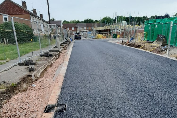 The project was hampered at several times by existing services still present within site, which delayed works until they were isolated/removed by other. This project utilises many different forms of external finished such as; Tarmac (porous and standard) Block Paving (permeable and standard) Slabs in gardens. It has two feature footpaths running across it – these are planted feature swales throughout the scheme that receive the rood water in through small decorative headwall unites. Italian stone ‘L’ shape benches are dotted along the footpaths.
